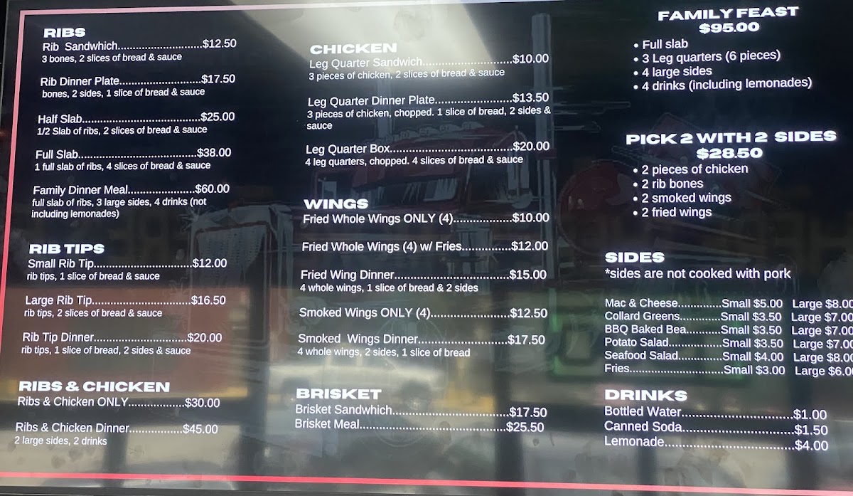 During lunch, savor quick bites such as fried wings or leg quarter dinners, each paired with delicious sides. Customers rave about the tender, flavorful ribs, perfectly fried chicken wings, and rich, cheesy mac and cheese. The sides, especially the baked beans, are a favorite among many.